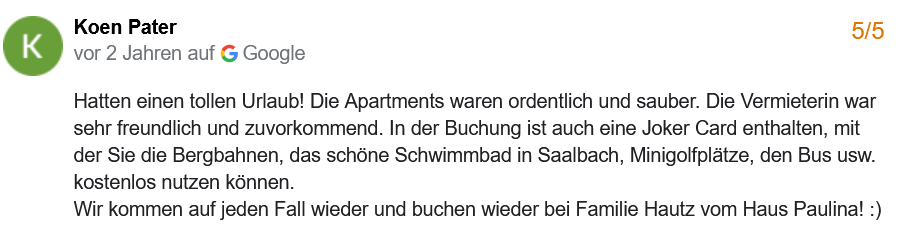 Nur 800 m entfernt starten Sie mit den Schönleitenbahnen direkt in den Skicircus Saalbach-Hinterglemm-Leogang-Fieberbrunn – inkl. Skidepot und Verleih! Das Ortszentrum von Saalbach erreichen Sie in nur 4 km.